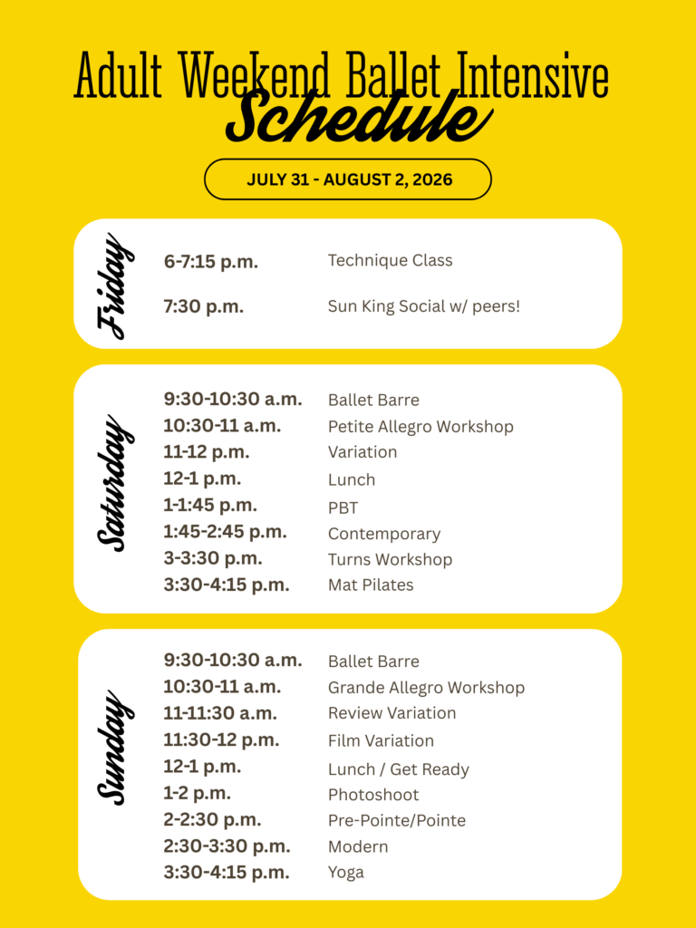 Our adult weekend ballet intensive is an opportunity for adults 18 and older to spend an entire weekend focusing on their training and meeting other like-minded individuals. There will be a mix of ballet technique and cross-training, as well as a photoshoot and the opportunity to perform and record a classical ballet variation. This intensive is suitable for all levels.